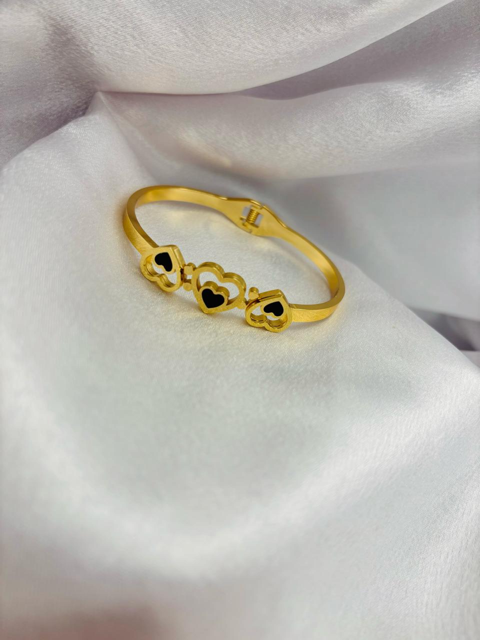 Celebrate elegance and love with this beautifully crafted gold bracelet, featuring three heart motifs accented with bold black enamel. The sleek kada-style design offers both durability and sophistication, making it a perfect accessory for everyday wear or special occasions. Its modern yet timeless appeal makes it a versatile piece to complement any outfit.
